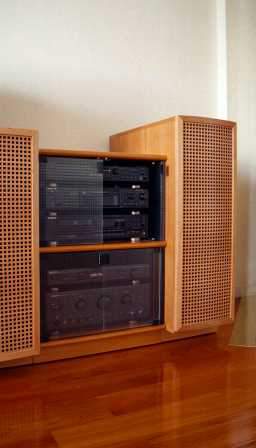 A modular cabinet for audio equipment (Prototype). To the left drawers for CD:s, DVD:s, and other recordings. Cabinets for a 5 + 1 loudspeaker system.